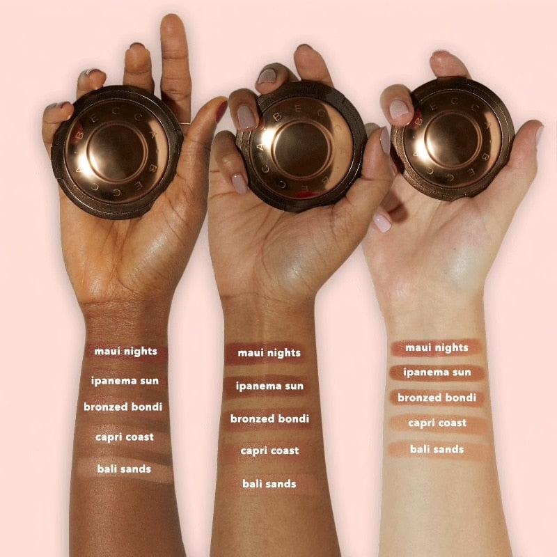 BECCA’s Sunlit Bronzer gives the natural glow of one who’s just spent the day in the gentle, dappled rays of the sun. Imparting healthy, natural warmth that steers well clear of orange-tinged territory, this neutral bronzer consists of a creamy, matte powder with just a hint of shimmer. The powder’s silky texture lets you customise your sun kissing – from a hint of light to just-stepped-off-the-beach bronze. Speaking of beaches, each of the five irresistibly radiant shades is inspired by a different sun-drenched destination: soft golden-beige ‘Bali Sands’ will give warmth to fair skin tones; golden-brown ‘Capri Coast’ gives radiance to light to medium skin tones; ‘Bronzed Bondi’ is the perfect amber for medium skin tones; ‘Ipanema Sun’ adds golden goddess glow to medium-dark skin tones and ‘Maui Nights’ gives an ultra-rich bronze to deep skin tones.