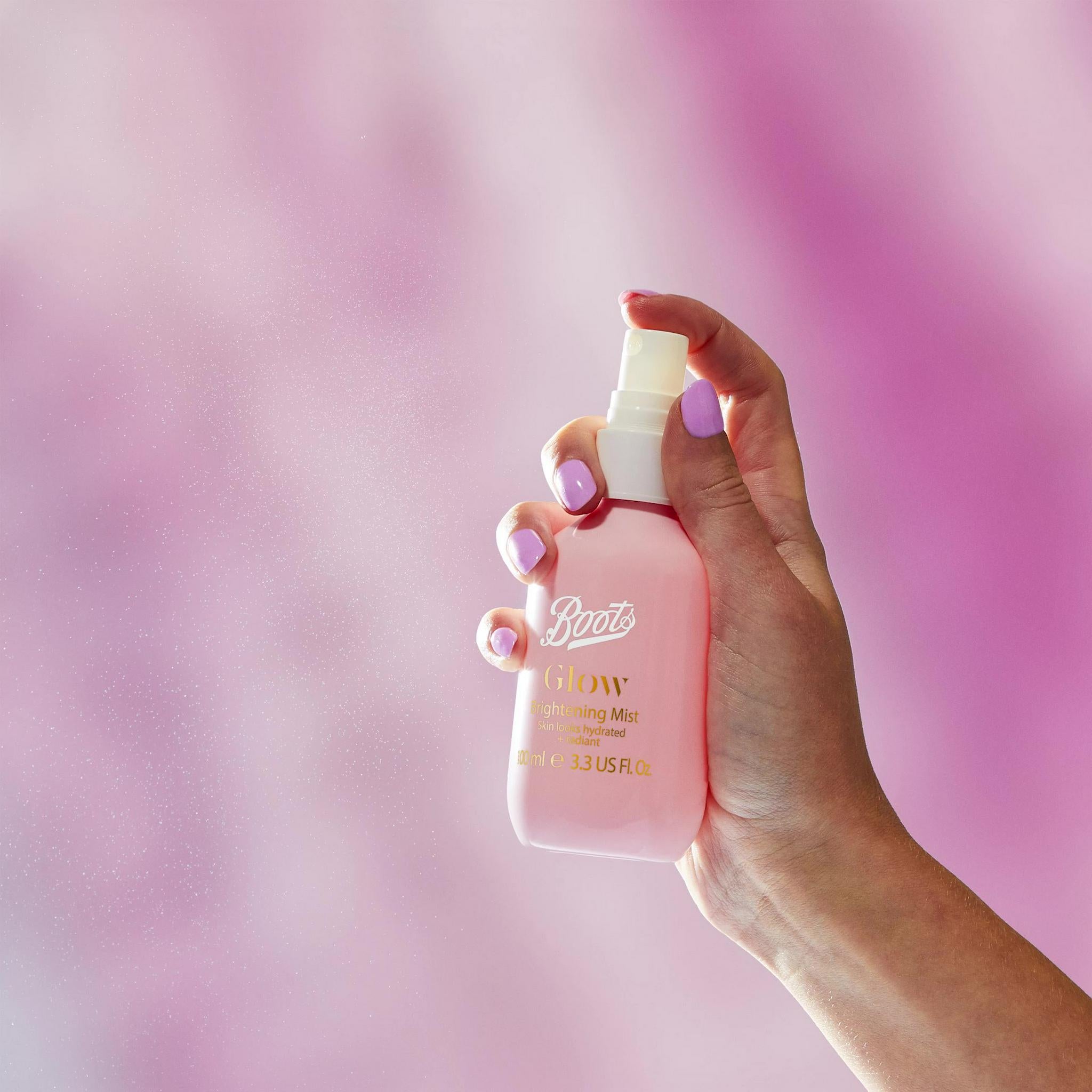 Our Boots Glow microfine mist refreshes and brightens skin tone, leaving it feeling hydrated and looking radiant. How to use Use as a wake up boost in the AM or as a hydrating fix in the PM. 1. Shake to mix 2. Close your eyes, hold mist 30cm away from face and spritz over face and neck. Hazards and Cautions Avoid spraying in eyes. If product gets into eyes rinse well with water. Do not apply to broken or irritated skin. Use only as directed. Keep out of reach of children. Store in a cool dry place. This is not food. Avoid direct sunlight. Important info Recycle information Bottle is widely recyclable Pump in not yet recyclable •Vegan •Not tested on animals