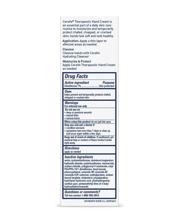 CeraVe Therapeutic Hand Cream moisturizes your hands, calms the skin and restores the skin’s natural barrier with a formula featuring hyaluronic acid, niacinamide and 3 essential ceramides that work together to lock in skins moisture and help restore your skin’s protective barrier. MVE technology encapsulates ceramides to ensure efficient delivery within the skin’s barrier and slow release over time. Supporting your protective skin barrier, long after you’ve finish applying. Our fragrance-free hand cream also contains dimethicone, a skin protectant, and a non-greasy, fast-absorbing formula helps restore and maintain smooth, soft skin.