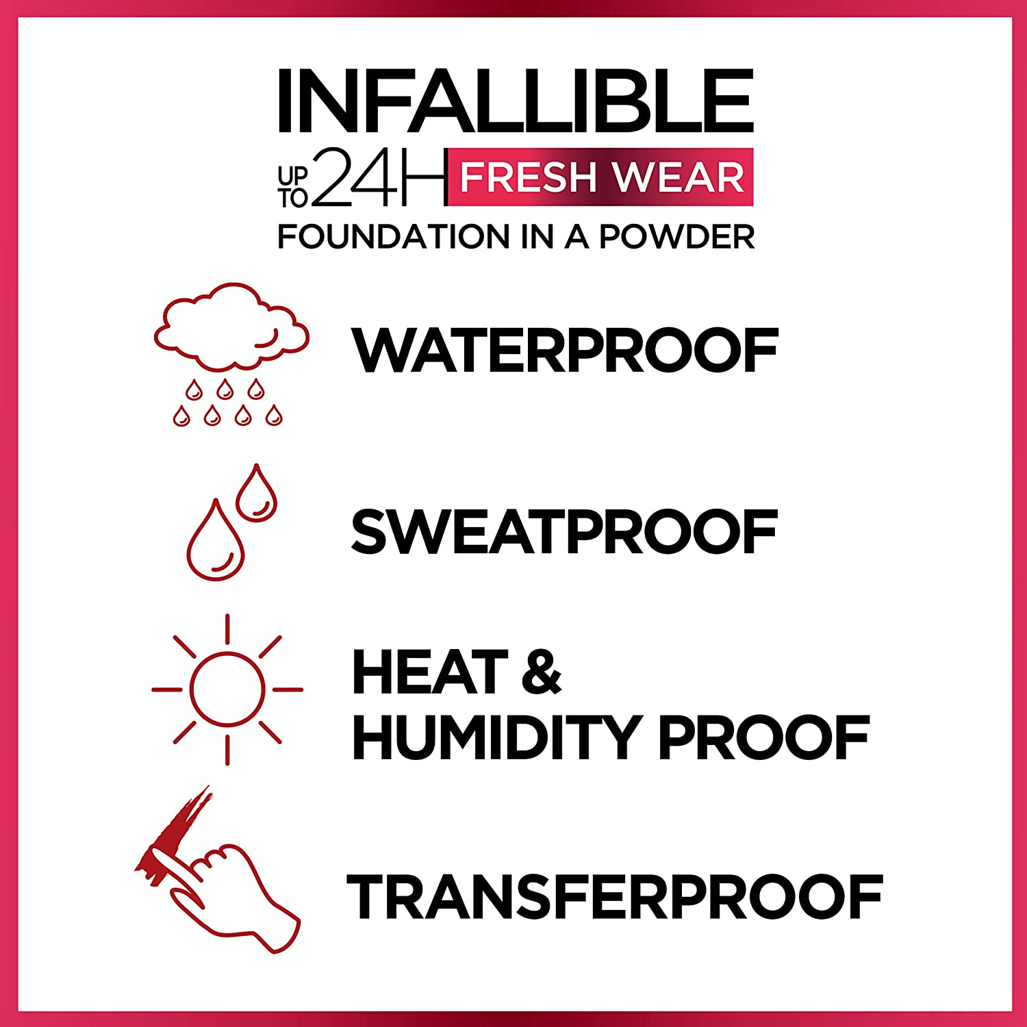 • Infallible up to 24hr Fresh Wear Foundation-in-a-powder covers like a liquid and mattifies with no cakey look