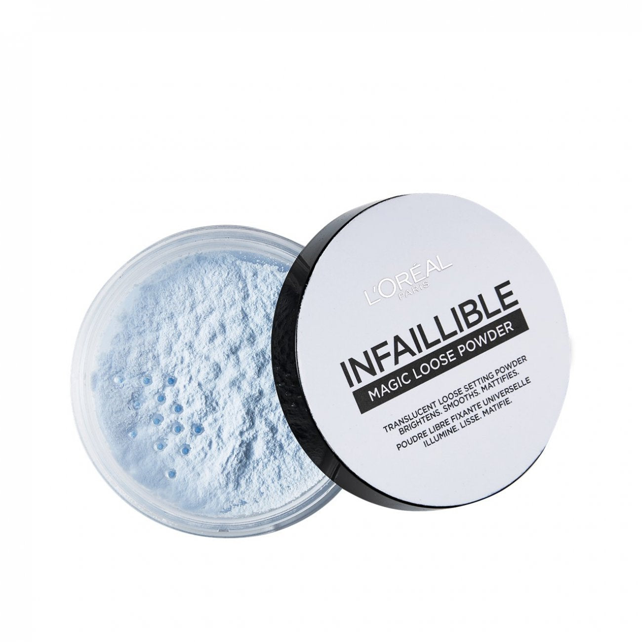 First, dust a little even coverage of L'Oréal Paris Infallible Magic Loose Powder all over the face with a large fluffy brush to lock make-up in place and keep it looking fresh and bright all day long. For a more extreme bright-eyed effect pack the product under your eyes using a dense brush or makeup sponge and leave to ‘bake' for a moment or two. Lastly, sweep away the excess to leave a flawless, creaseless finish.