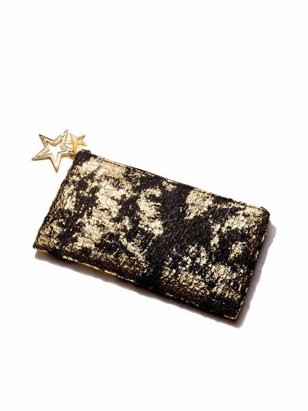 Set includes a star makeup MAC cosmetics bag, medium face fan brush 143SES, extra dimension skin finish powder in whisper of Guilt, and a dazzle glass lipgloss in Sprinkled in Twinkle!