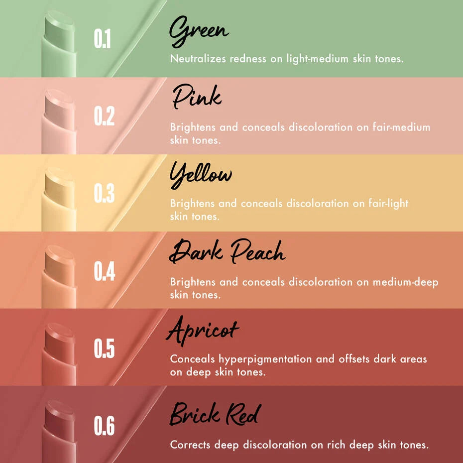 Fix dullness, redness, blemishes, dark spots, undereye circles, and discoloration for all skin tones and all skin types! After color correcting, layer on the complexion shades as needed to conceal & brighten. These comfortable 12-hour wear complexion concealer stick shades layer flawlessly under and over foundation for a full-face fix!