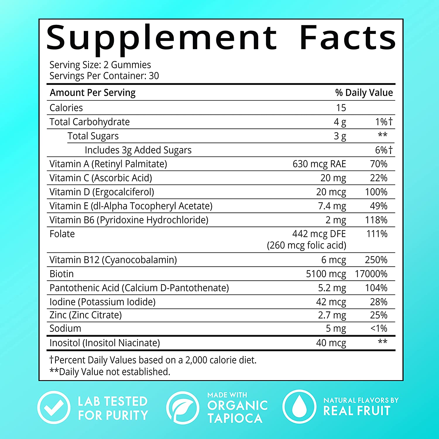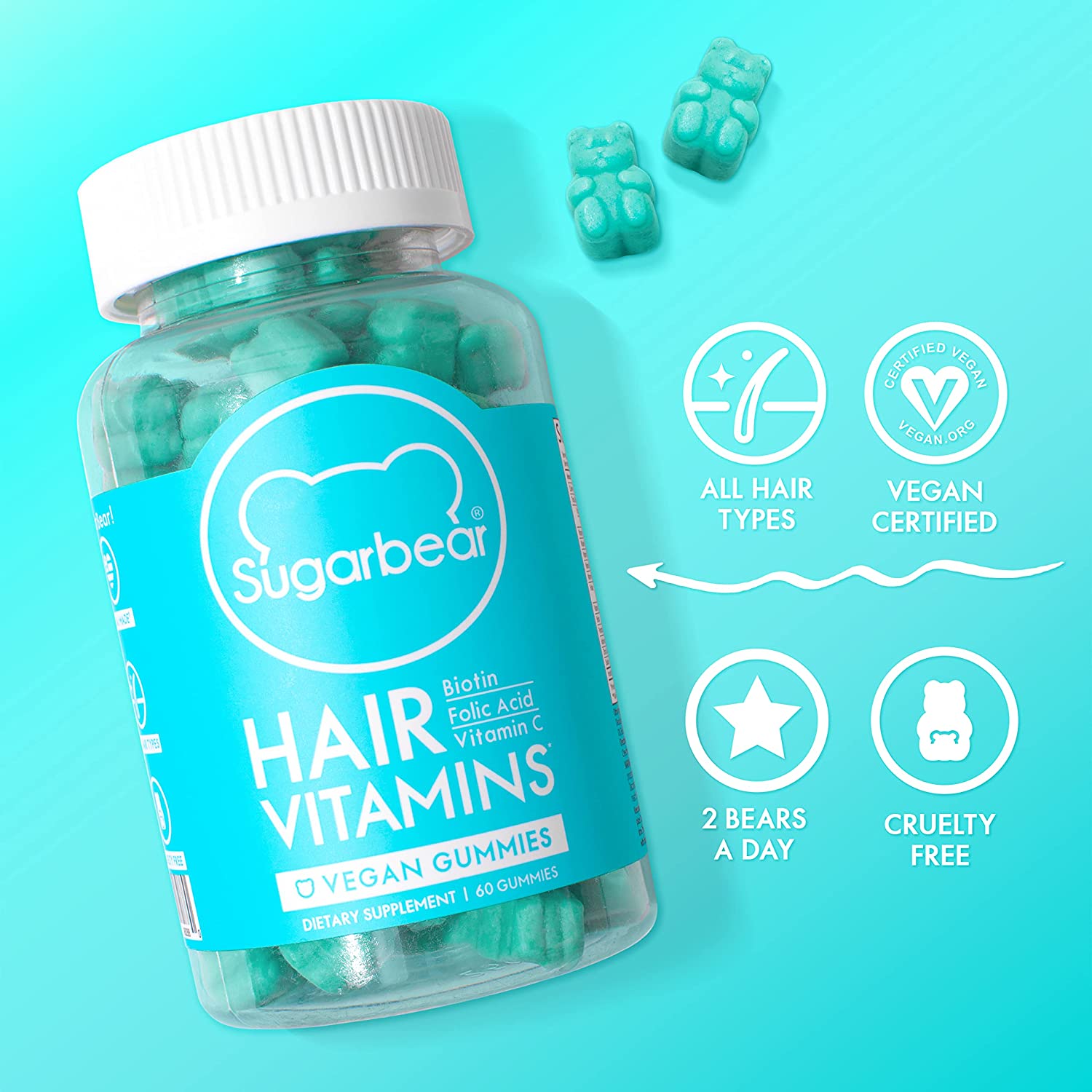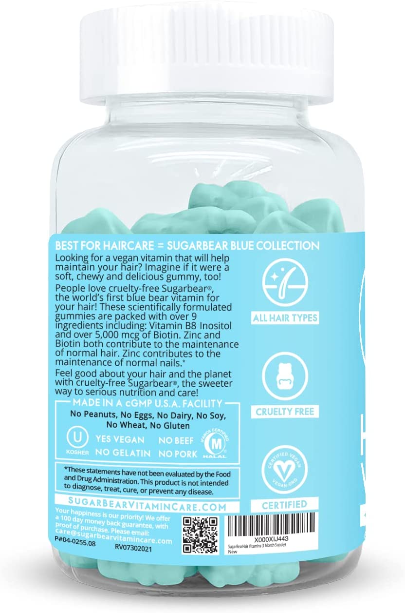 People love cruelty-free Sugarbear®, the world’s first blue bear vitamin for your hair! These scientifically formulated gummies are packed with over 9 ingredients including: Vitamin B8 Inositol and over 5,000 mcg of Biotin. Zinc and Biotin both contribute to the maintenance of normal hair. Zinc contributes to the maintenance of normal nails.*